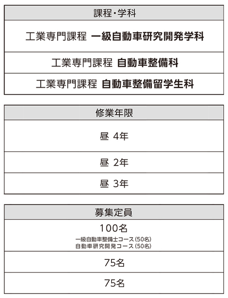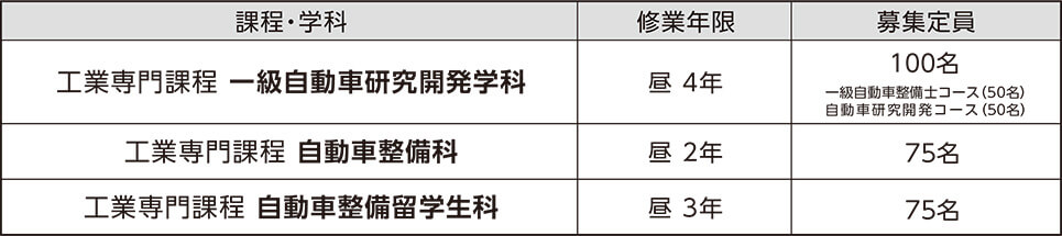 2026年3月 高等学校卒業見込みの方、または、同等以上の学力があると認められた方、普通自動車運転免許(MT免許)の取得 ※2が可能な方、全学科とも実技習得が可能な方 |
