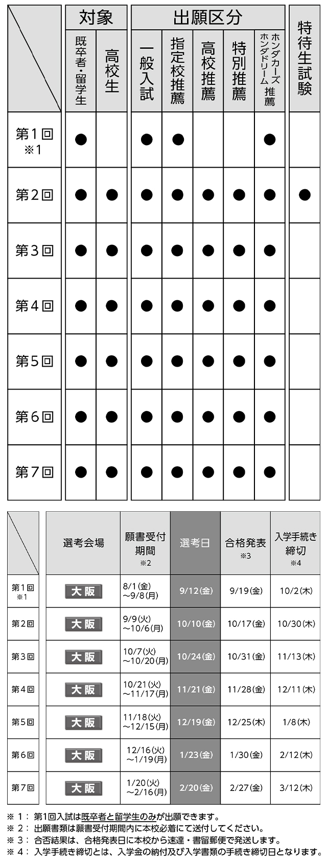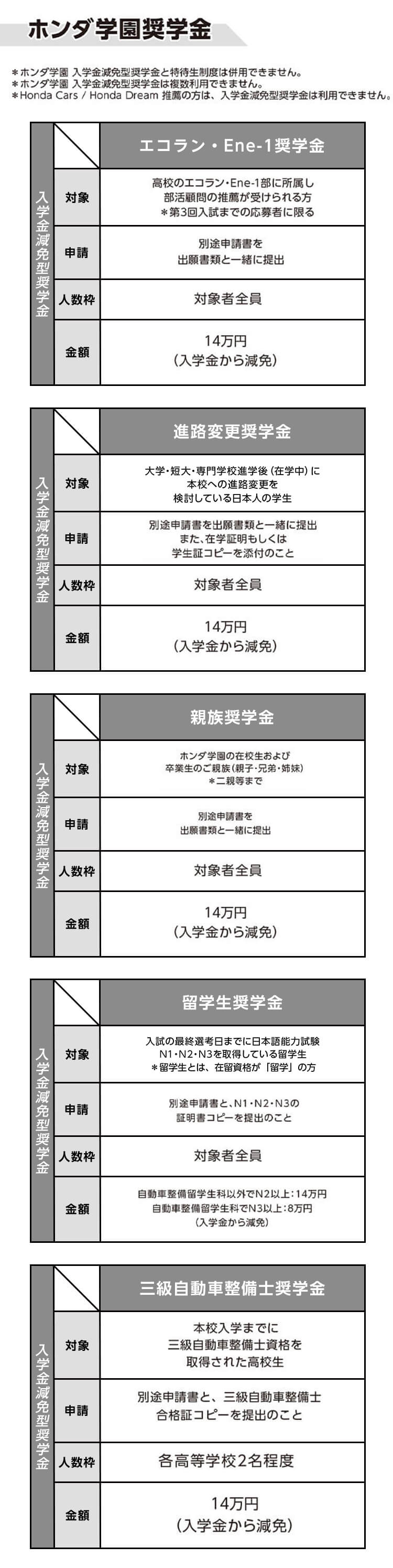 | 選抜料 | 20,000円(銀行振込のみ) ※Honda Cars / Honda Dream推薦、留学生の指定校推薦、学生紹介制度を利用される方及び再応募の場合は選抜料振込は不要です。 |